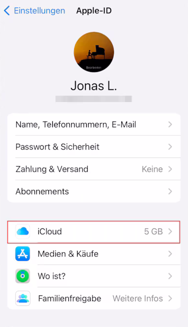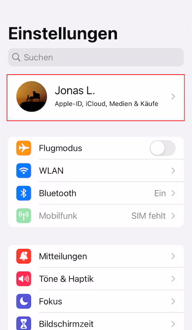 2. Schritt: Tippen Sie auf Ihrem Namen. (Apple-ID, iCloud, Medien & Käufe)