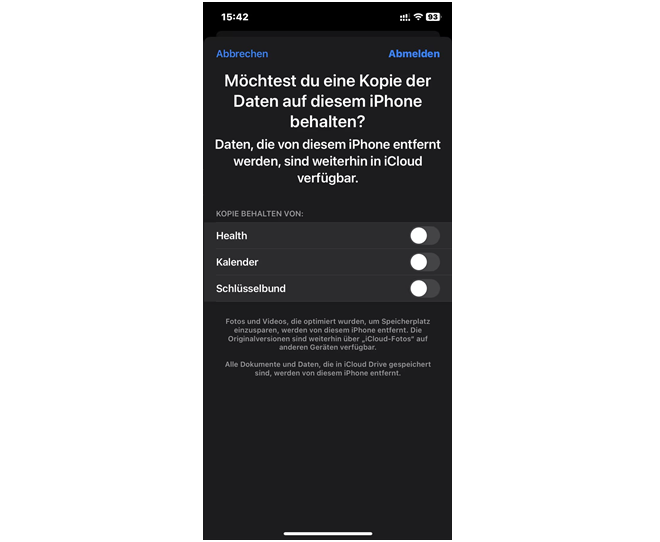 Schritt 4. Schieben Sie den Reiter neben „Fotos“, um die iCloud-Fotodaten auf Ihrem iPhone zu behalten. Tippen Sie dann auf Abmelden.