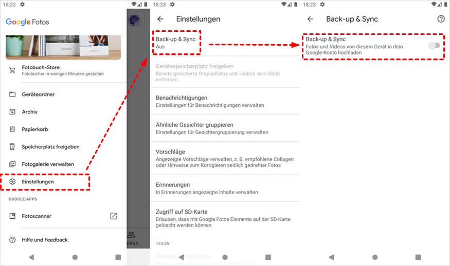 Schritt 2. Tippen Sie auf das Account-Profil, um „Google Fotos-Einstellungen” zu finden, und aktivieren Sie „Back-up & Sync”.