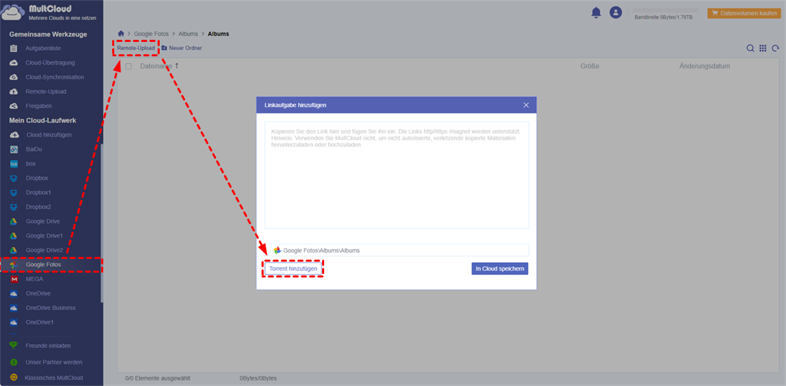 Außerdem bietet MultCloud auch andere spezielle Funktionen wie „Cloud-Übertragung”. Wenn Sie Fotos von Google Photos zu einem anderen übertragen möchten, wie z.B. Google Photos zu Flickr übertragen, kann diese Funktion Ihre Anforderungen erfüllen. Darüber hinaus können Sie auch Dateien von URL und Torrent-Dateien in jede Cloud hochladen, wie z.B. das Hochladen zu Google Drive von URL durch die Funktion namens Remote Upload.