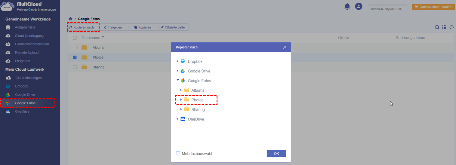 Wählen Sie die zu verschiebenden Fotos in Ihrem ersten Google Fotos aus, klicken Sie mit der rechten Maustaste auf „Kopieren nach“ und wählen Sie im sich öffnenden Fenster den Ordner „Photos“ unter Ihrem anderen Konto als Ziel. Klicken Sie dann auf „OK”, um sie zu übertragen.