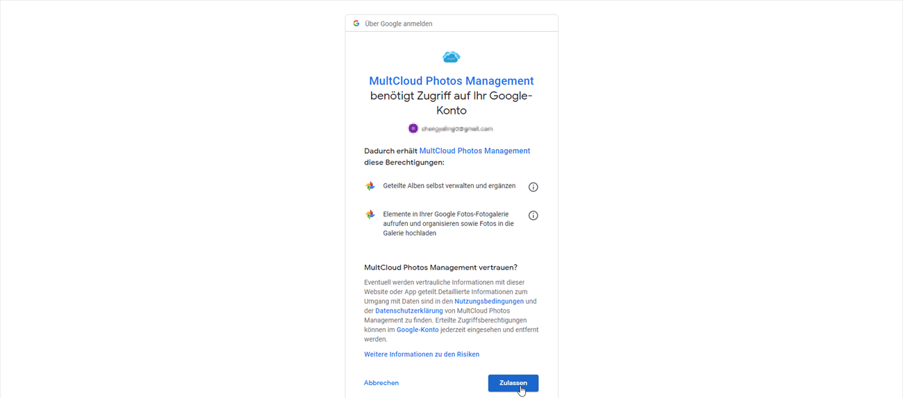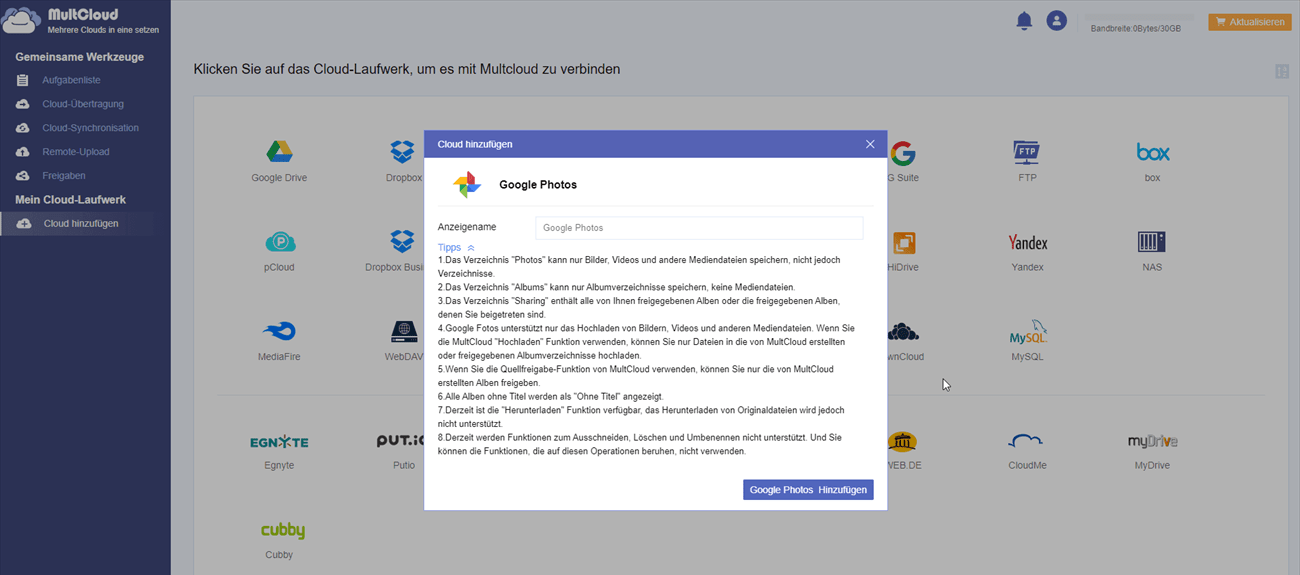 Schritt 2. Gehen Sie zu MultCloud und fügen Sie alle Google-Konten hinzu. Wählen Sie Google Photos unter „Cloud hinzufügen“ aus und geben Sie den Anzeigename ein. Wechseln Sie dann zur offiziellen Google-Seite und autorisieren Sie sie.