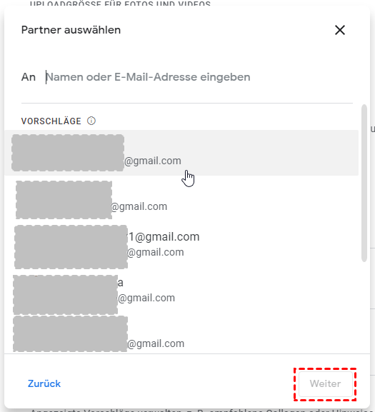 Schritt 8. Öffnen Sie „Mit Partner teilen“, wählen Sie alle Fotos aus und klicken Sie auf „Partner auswählen“, um sie auf Ihr Konto zu übertragen.