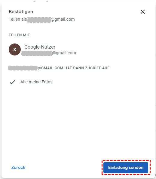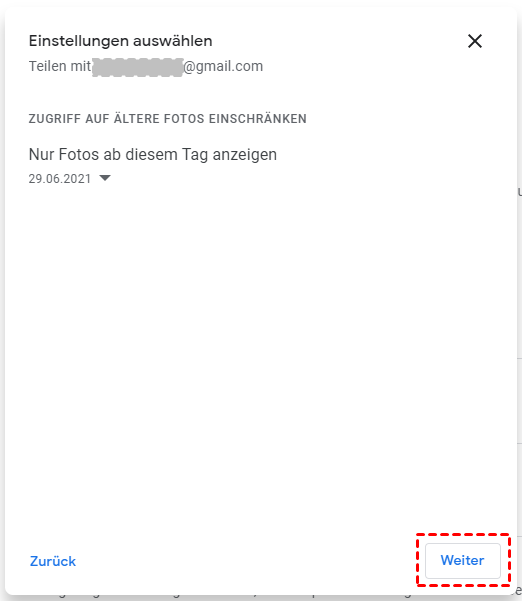 Hinweis: In diesem Schritt können Sie alle Fotos oder nur einen Teil davon mit einem anderen Konto teilen.