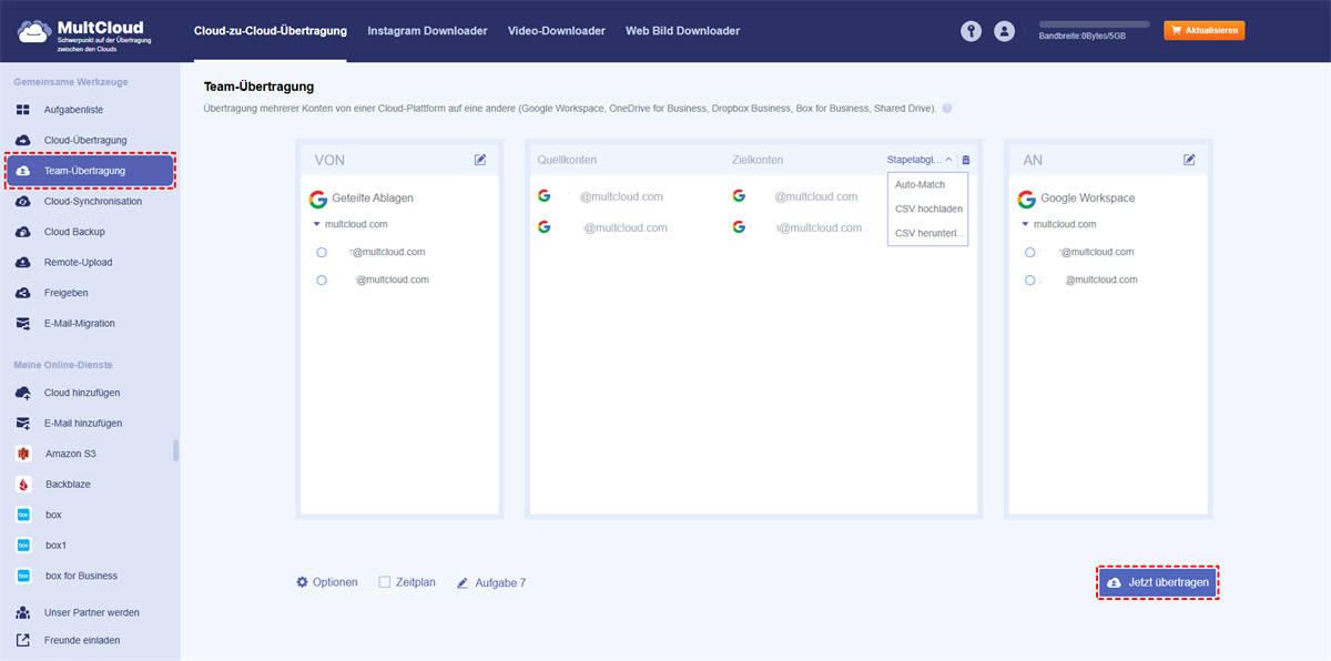 Darüber hinaus, wenn Ihr Team geteilte Ablage direkt in das Google Workspace „Meine Ablage“ eines anderen Domäne oder des gleichen kopieren muss, und Sie der Administrator Ihres Teams sind, steht der „Team-Übertragung“ bereit, um Ihnen professionell dabei zu helfen, geteilte Ablage entsprechend in „Meine Ablage“ von mehreren Konten auf einmal zu migrieren.