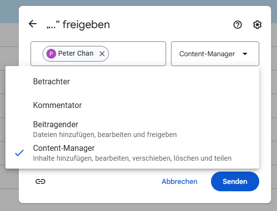 Wenn Sie Inhalte aus einer geteilten Ablage verschieben oder einer geteilten Ablage hinzufügen möchten, benötigen Sie Zugriffsrechte, die über die Stufe „Beitragender“ hinausgehen. Andernfalls bitten Sie den „Content-Manager“ dieser geteilten Ablage, Ihre Zugriffsrechte zu ändern.