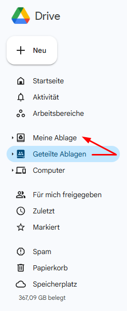 Tipp: Wenn Sie verwirrt über die Beziehung zwischen geteilte Ablagen, Meine Ablage, Google Workspace, Google Drive und dem Ordner „Für mich freigegeben“ sind, beachten Sie bitte den ersten Tipp der Methode 2 oben.