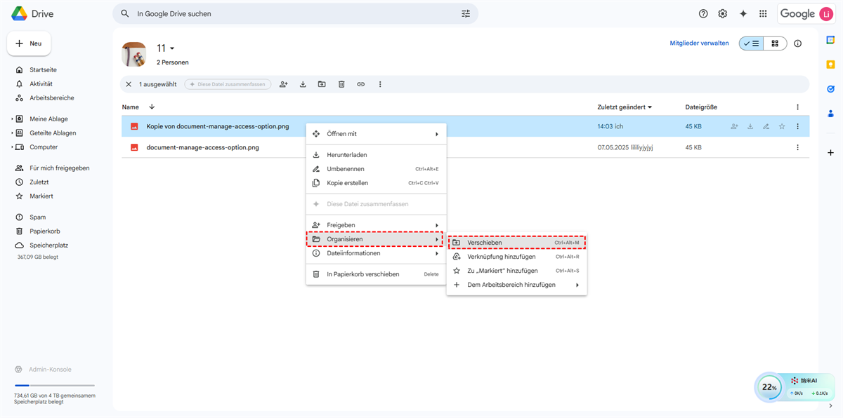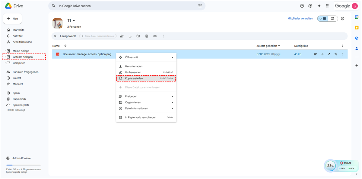 Methode 1. Geteilte Ablage nach „Meine Ablage“ durch „Kopie erstellen“ kopieren