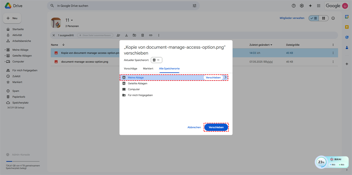 Schritt 6. Wählen Sie im Popup-Fenster „Meine Ablage“ aus und klicken Sie auf „Verschieben“. Dann finden Sie die Kopien in Ihrem My Drive.