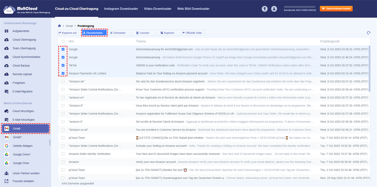 Wenn Sie viele E-Mails auf einem USB-Stick speichern möchten, empfiehlt sich der Drittanbieterdienst MultCloud. Damit können Sie mehrere E-Mails von Gmail auf Ihren PC herunterladen. MultCloud ist ein webbasierter Cloud-Speicherverwaltungsdienst, der das direkte Speichern von E-Mails in Clouds/auf Computern unterstützt. Aktuell unterstützt MultCloud Gmail, Outlook, iCloud Drive, Google Drive, iCloud Photos, Google Photos, MEGA, Google Workspace, Dropbox, OneDrive usw.