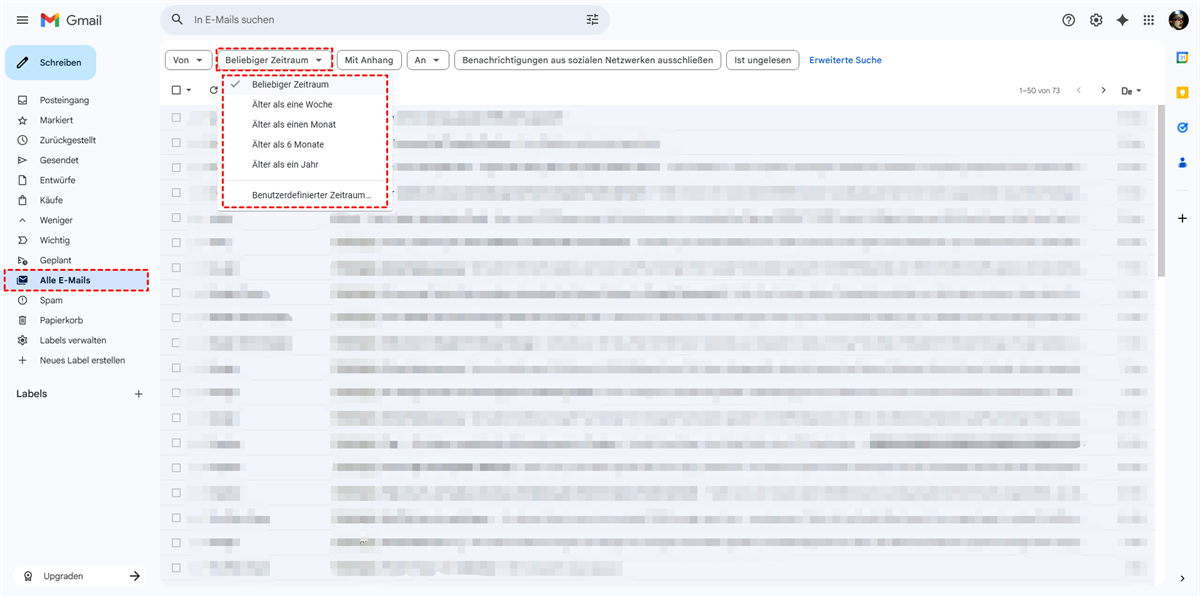 2. Klicken Sie auf „Mehr“ > „Alle E-Mails“, um alle Gmail-E-Mails anzuzeigen. Wählen Sie anschließend unter dem Suchfeld „Beliebiger Zeitraum“ aus, um andere Datumsbereiche festzulegen, z. B. Älter als eine Woche, Älter als ein Monat, Älter als 6 Monate, Älter als ein Jahr oder einen benutzerdefinierten Zeitraum. Wählen Sie den für Sie passenden Datumsbereich.