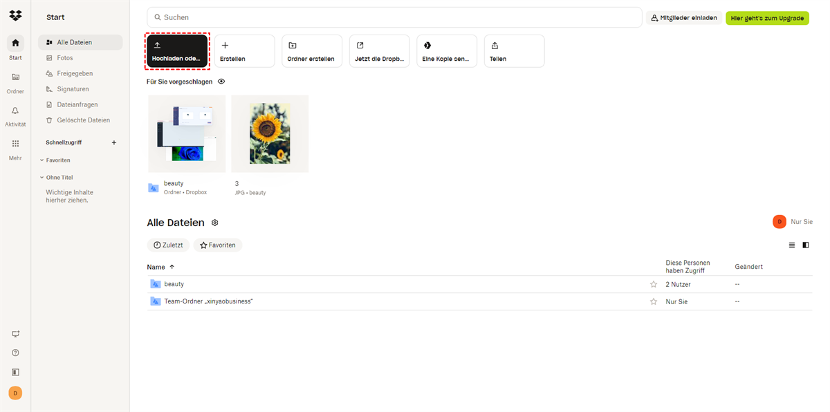 Schritt 3. Melden Sie sich bei Ihrem Dropbox-Konto an, klicken Sie auf Hochladen oder ablegen, um diese Dateien manuell von Ihrem lokalen PC auf Dropbox hochzuladen, und warten Sie, bis der Vorgang abgeschlossen ist.