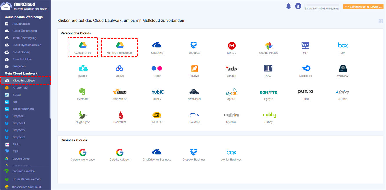 Zusätzlich zu den integrierten Funktionen von Google Drive, um die oben genannten Operationen zu erreichen, können Sie auch einen fortschrittlicheren Multi-Cloud-Speicher-Manager --- MultCloud verwenden, um die oben genannten Hochladen- und Übertragungsoperationen durchzuführen. Im Gegensatz zu vielen anderen Cloud-Speicher-Managern, kann MultCloud „Shared with me” separat verwalten.