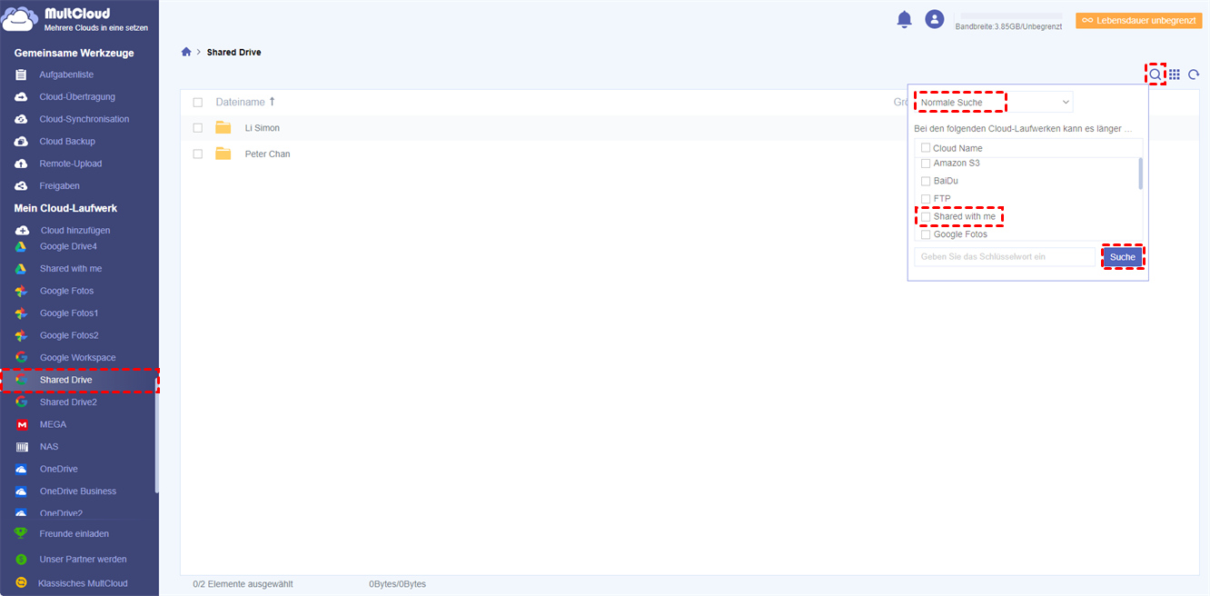 Schritt 1. Öffnen Sie „Shared with me” in MultCloud, Suchoptionen finden Sie auf der rechten Seite der Schnittstelle, klicken Sie auf das Symbol, um "Normale Suche" zu wählen, wählen Sie „Shared with me” in der Liste und geben Sie Schlüsselwörter für die Suche ein.
