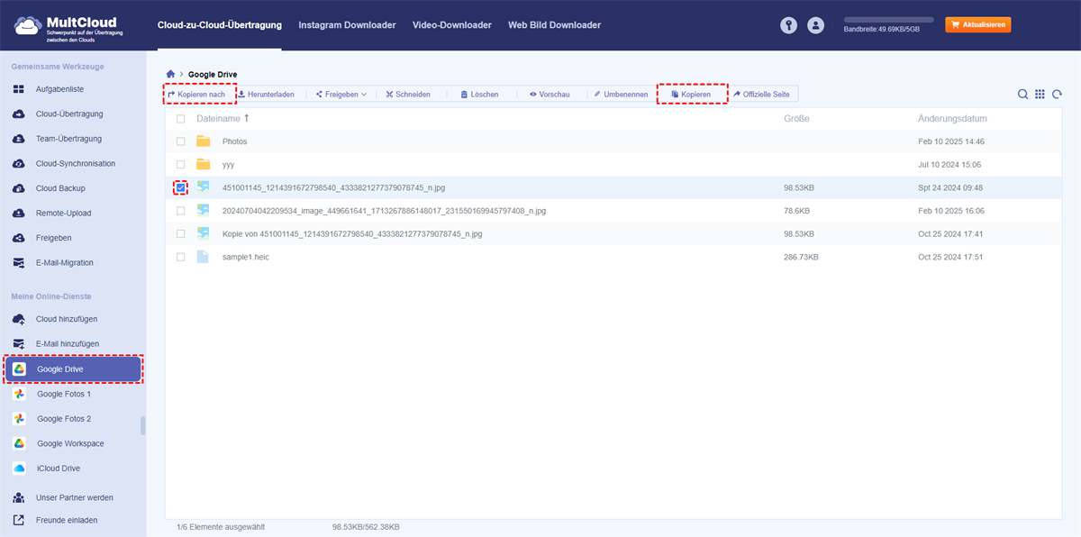 Wenn keiner der oben genannten Methoden das Problem „Google Drive kann keine Kopie erstellen“ lösen kann, können Sie es mit MultCloud versuchen. Es hilft Ihnen dabei, Dateikopieraufgaben in Google Drive einfacher zu erledigen. Darüber hinaus können Sie Dateien von Google Drive zu einem anderen Cloud-Speicher kopieren oder von einem Google Drive-Konto auf ein anderes kopieren.