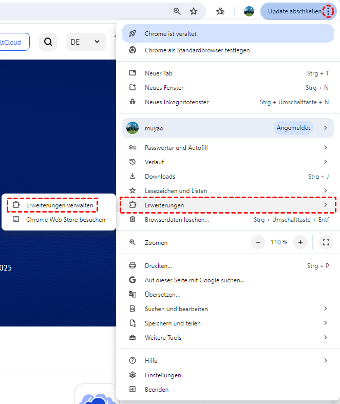 Schritt 1. Wenn Ihr Werbeblocker eine Browser-Erweiterung ist, klicken Sie auf das Symbol mit den drei Punkten in der oberen rechten Ecke von Google Drive. Gehen Sie dann zu Erweiterungen > Erweiterungen verwalten.