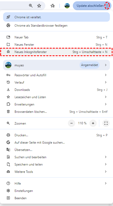 Schritt 1. Um den Inkognitomodus in Google Chrome zu aktivieren, drücken Sie gleichzeitig STRG+Umschalttaste+N. Oder klicken Sie auf das Drei-Punkte-Symbol in der oberen rechten Ecke und wählen Sie „Neues Inkognitofenster“.