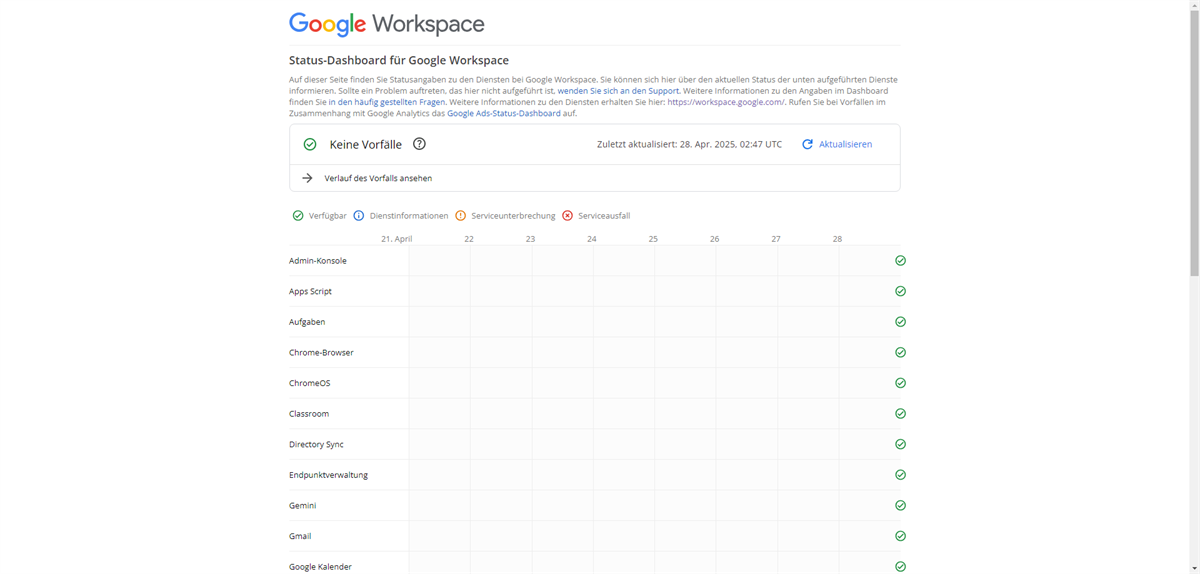 Jegliche serverseitige Fehler, mit denen Google Drive konfrontiert sein könnte, können Replikationsfehler verursachen. Daher ist es eine gute Idee, zu überprüfen, ob alle Google Drive-Server aktiv sind. Um dies zu überprüfen, gehen Sie zu Status-Dashboard für Google Workspace.