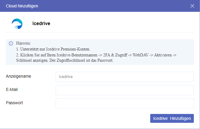 Hinweis: Das „Passwort“ im Icedrive-Anmeldefenster kann erhalten werden, indem Sie die Icedrive-Website öffnen und auf Ihren Icedrive-Benutzernamen -> 2FA & Zugriff -> WebDAV -> Aktivieren -> Schlüssel anzeigen klicken.