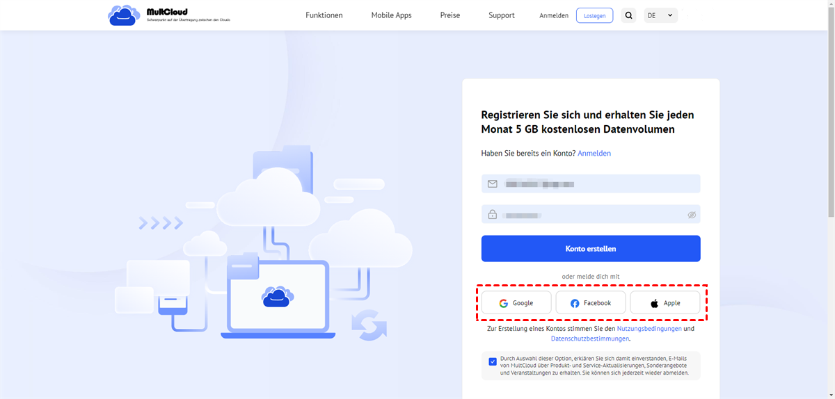 Schritt 1: Registrieren Sie sich für ein kostenloses MultCloud-Konto. Alternativ können Sie sich mit Ihrem Google/Apple/Facebook-Konto registrieren.