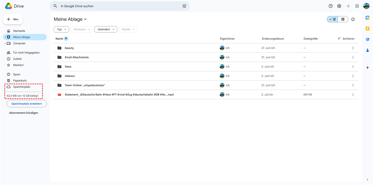 Wie viel Speicherplatz Sie noch haben, können Sie ganz einfach überprüfen. Melden Sie sich einfach online bei Google Drive an und öffnen Sie den letzten Tab in der linken Seitenleiste.