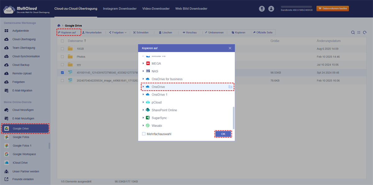 Schritt 2. Wählen Sie alle oder bestimmte Dateien aus, tippen Sie dann im oberen Menü auf „Kopieren auf“, wählen Sie OneDrive und klicken Sie auf „OK“, um von Google Drive zu OneDrive zu kopieren.