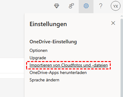 Schritt 1. Melden Sie sich bei Ihrem OneDrive-Konto an, klicken Sie oben rechts auf das Symbol „Einstellungen“ und wählen Sie „Importieren von Cloudfotos und -Dateien“.