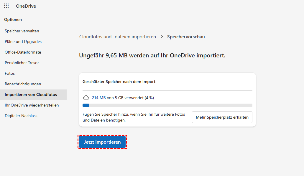 Tipp: Wenn Ihr OneDrive-Speicherplatz nach dem Import nicht ausreicht, wird die Fehlermeldung „Nicht genügend Speicherplatz in OneDrive für ** GB-Import“ angezeigt. Stellen Sie daher sicher, dass Ihr OneDrive-Cloud-Speicherplatz für die Migration ausreicht, oder geben Sie Speicherplatz in OneDrive frei, um Speicherplatz freizugeben.