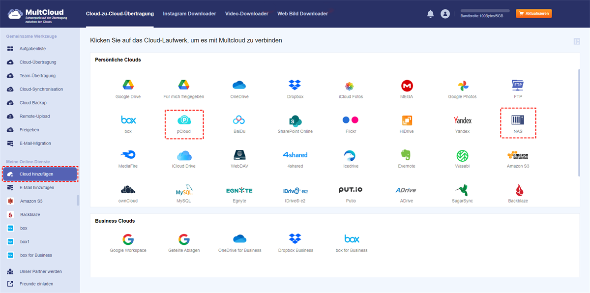 MultCloud unterstützt Clouds