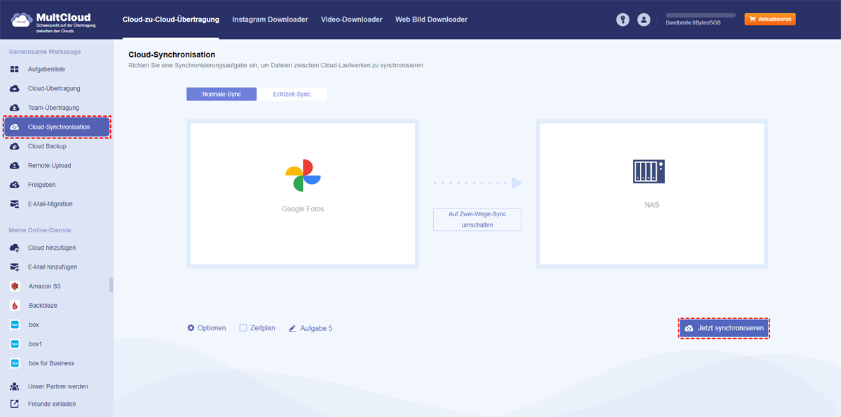 Tipp: Genau wie bei Cloud-Übertragung können Sie E-Mail und Filter in den Optionen einrichten und Zeitplan aktivieren. Darüber hinaus können Sie Synchronisierungsmodi wie Echtzeit-Sync, Zwei-Wege-Synchronisation, Einweg-Synchronisation und mehr einrichten.