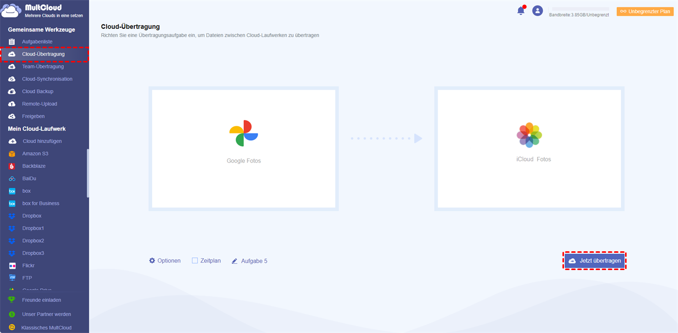 Schritt 3. Klicken Sie nun auf „Cloud-Übertragung“, wählen Sie Google Fotos als Quelle und iCloud Fotos als Ziel. Drücken Sie dann auf „Jetzt übertragen“.