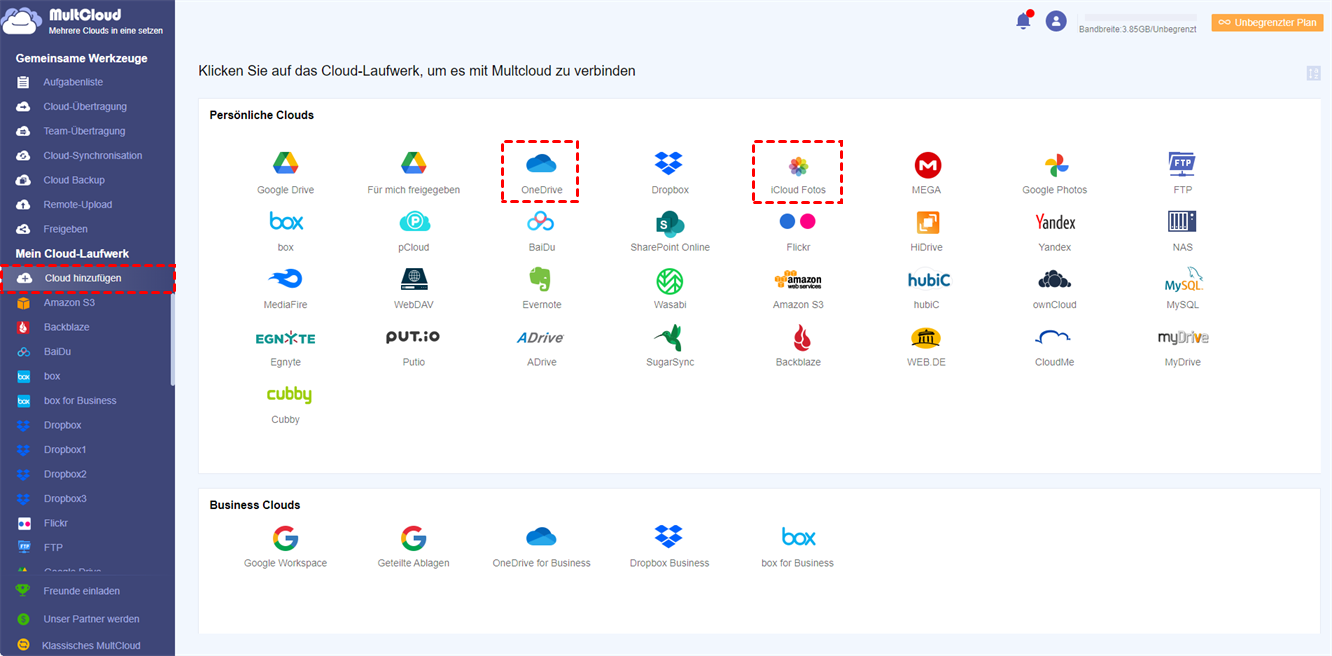 Mit dem professionellen Multi-Cloud-Speicher-Manager MultCloud müssen Sie weder Dateien herunterladen noch sich Gedanken über die Internetgeschwindigkeit machen - denn mit MultCloud können Sie Google Fotos und OneDrive direkt auf einer Plattform nutzen, und der Synchronisierungsprozess läuft auf dem Server.