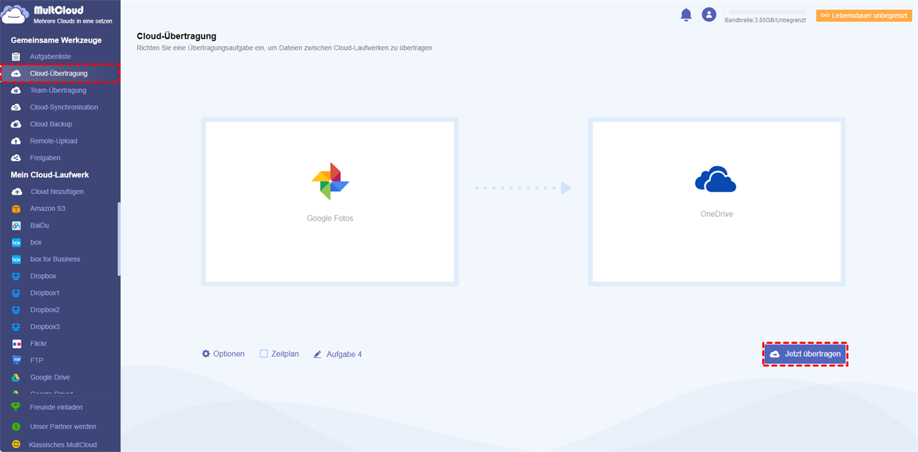 Schritt 3. Gehen Sie auf „Cloud-Übertragung” auf der linken oberen Seite und wählen Sie Google Fotos als Quellverzeichnis und OneDrive als Zielverzeichnis. Tippen Sie dann auf „Jetzt übertragen”.