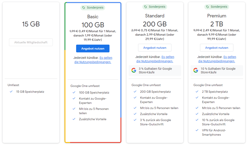 | Basic: 100 GB | 1,99 Euro/Monat |