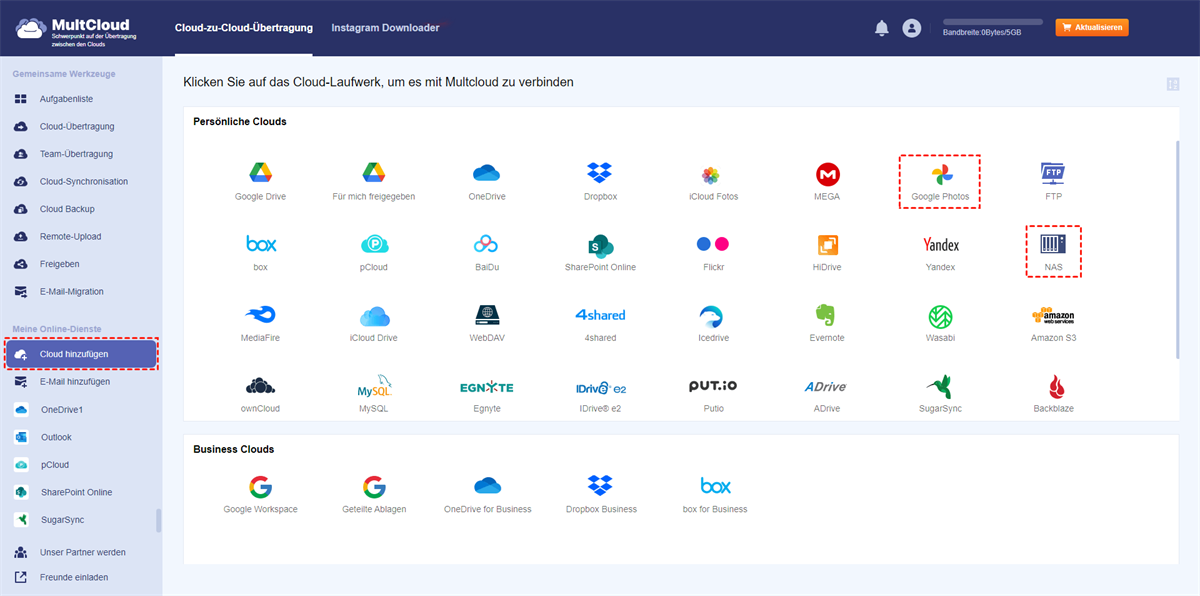 MultCloud ist ein webbasierter Cloud-Speicherverwaltungsdienst, der Benutzern einen nützlichen Ort zur Verwaltung verschiedener Cloud-Dienste bietet, darunter Google Drive, Google Fotos, OneDrive, OneDrive for Business, Dropbox, Dropbox Business, MEGA, Flickr, NAS, pCloud, Box, Box for Business und so weiter.