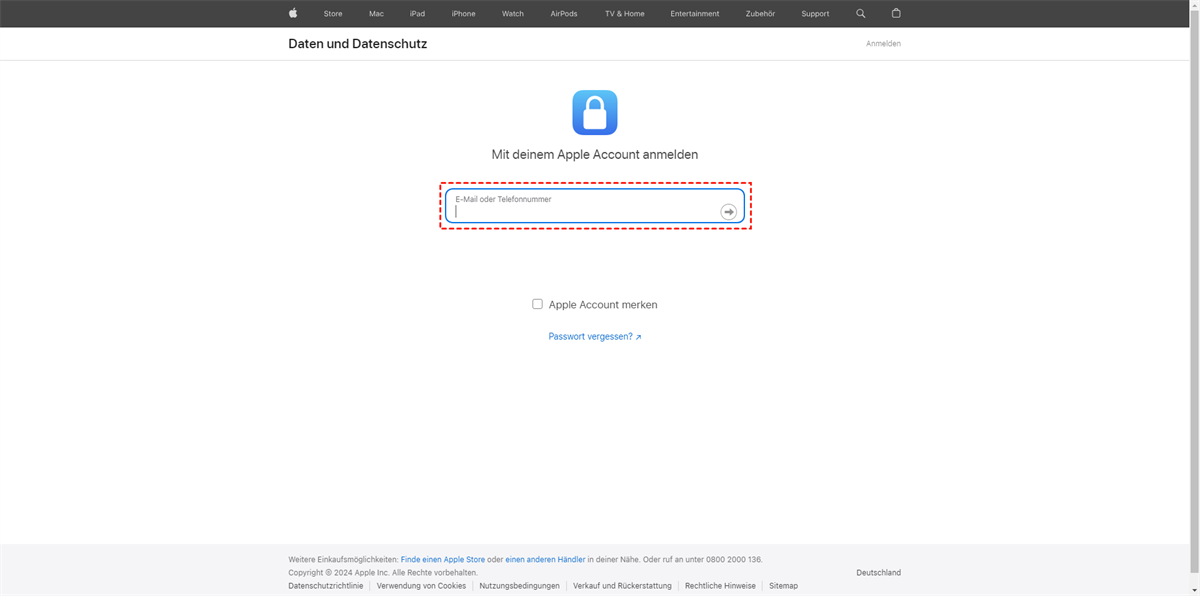 1. Melden Sie sich bitte auf der Seite „Apple Daten und Datenschutz“ bei Ihrem Apple-Konto an.