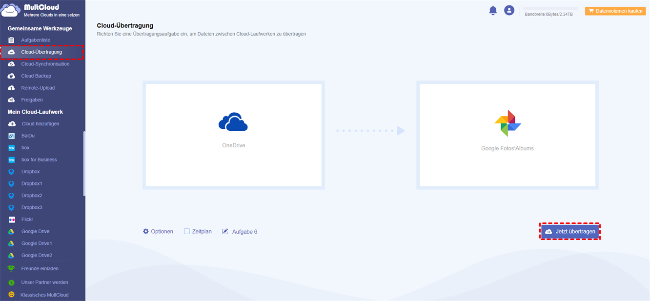 Wenn Sie Bilder von Google Fotos zu OneDrive übertragen möchten, können Sie MultCloud verwenden, um das Ziel einfach zu erreichen. Mit diesem professionellen Dienst können Sie auch Dateien zwischen verschiedenen Clouds übertragen, ohne sie herunterzuladen und wieder hochzuladen. Wenn Sie sich fragen, wie Sie Google Drive in Dropbox sichern können, kann Cloud Backup von MultCloud das auch problemlos erledigen.