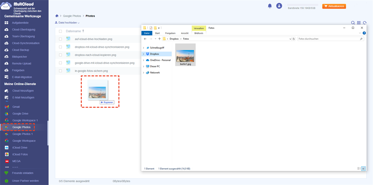 | ?MultCloud verwenden | Mit MultCloud können Sie Fotos einfach und direkt hochladen. |