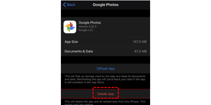 Für iPhone: Gehen Sie zu Einstellungen > Allgemein > iPhone-Speicher > Google Fotos > App löschen. Diese Option löscht alle Daten und den Cache der Google Fotos-App. Anschließend können Sie zum App Store gehen und die Google Fotos-App erneut installieren.