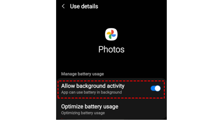 Für Android: Gehen Sie zu Einstellungen > Apps > Fotos > Akku > Hintergrundaktivität zulassen. Auf diese Weise kann Google Fotos im Hintergrund synchronisieren.