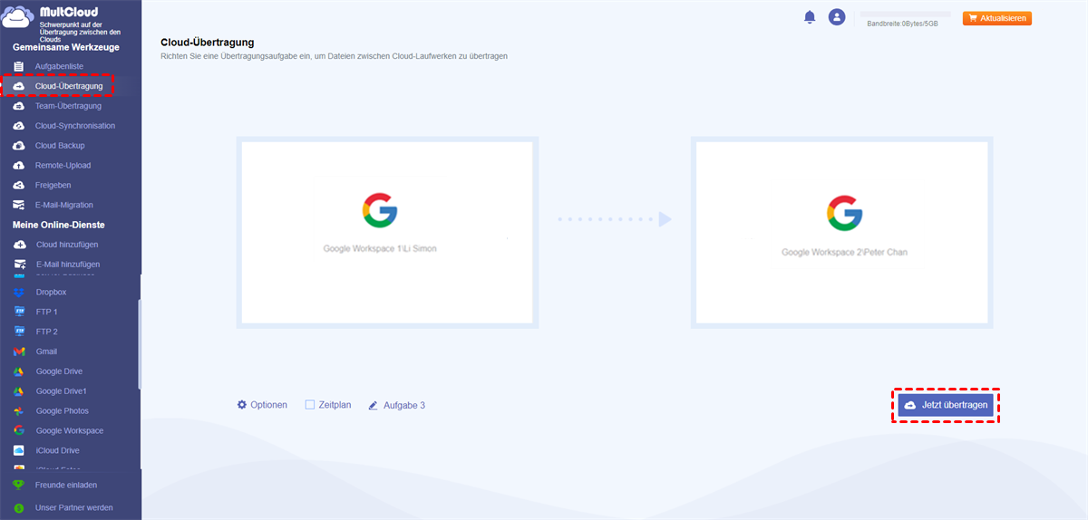 - MultCloud kann automatisch Daten von Google Workspace auf ein anderes Konto übertragen, wenn Sie unter „Zeitplan“ eine geplante Cloud-Dateiübertragung einrichten.