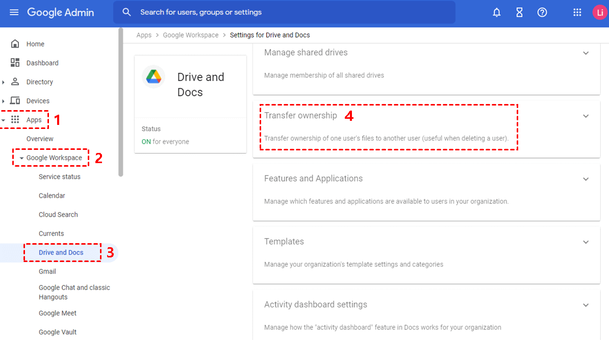 Schritt 1. Klicken Sie in der Google Admin-Konsole jeweils auf Apps > Google Workspace > Laufwerke und Dokumente > Übertragung des Eigentums.