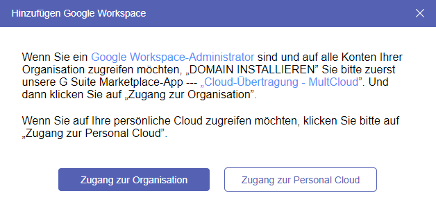 - Wenn Sie ein Unterkonto unter dem Google Workspace-Administratorkonto sind und Daten übertragen müssen, müssen Sie beim Hinzufügen des Kontos „Zugang zur Personal Cloud“ auswählen.
