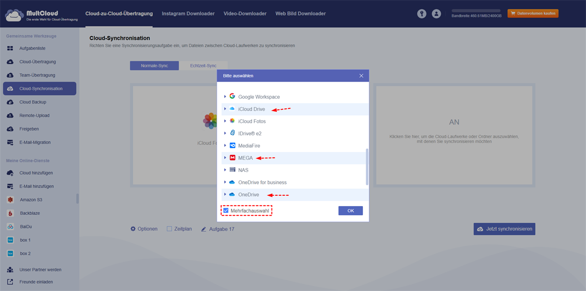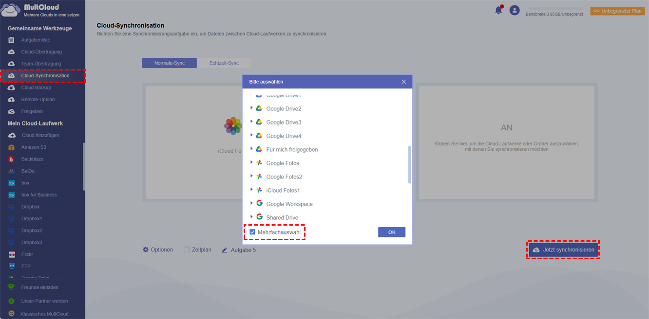- MultCloud unterstützt auch das gleichzeitige Sichern von iCloud Fotos Daten auf mehrere Cloud-Konten. Sie können die „Cloud-Synchronisation“-Schnittstelle aufrufen und mehrere Cloud-Kontenpfade als Ziel auswählen.