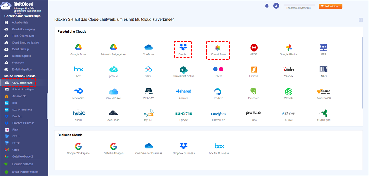 MultCloud unterstützt Clouds