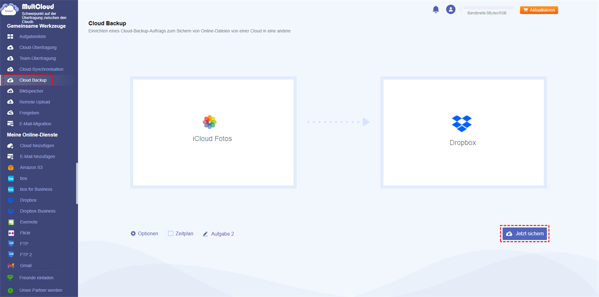 Wenn Sie außerdem Ihre iCloud-Fotobibliothek nur zur Migration in Dropbox sichern, bietet MultCloud die Cloud-Übertragung-Funktion, um iCloud-Fotos auf OneDrive und andere Clouds zu übertragen, ohne dass das Risiko eines Datenverlusts besteht.