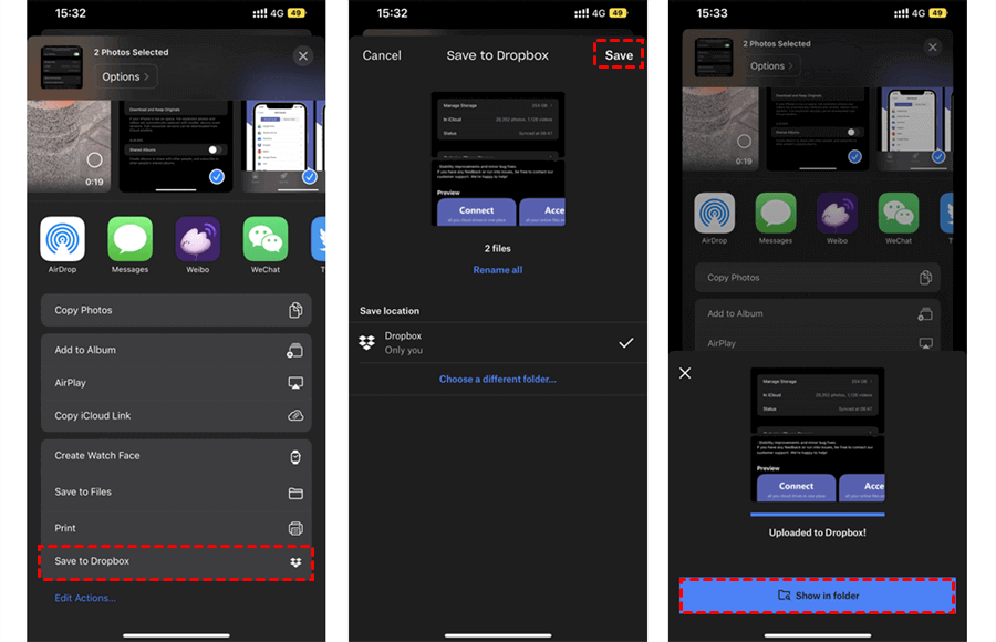 Schritt 4. Ihre ausgewählten iCloud-Fotos werden im Hintergrund in Dropbox hochgeladen. Wenn der Vorgang abgeschlossen ist, tippen Sie auf „In Ordner teilen“ und die Dropbox-App wird geöffnet.