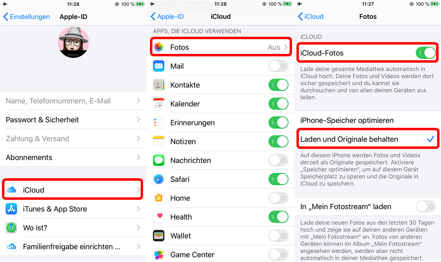 Schritt 1. Gehen Sie zu den Fotoeinstellungen, aktivieren Sie die iCloud-Fotosynchronisierung und wählen Sie „Laden und Originale behalten“.