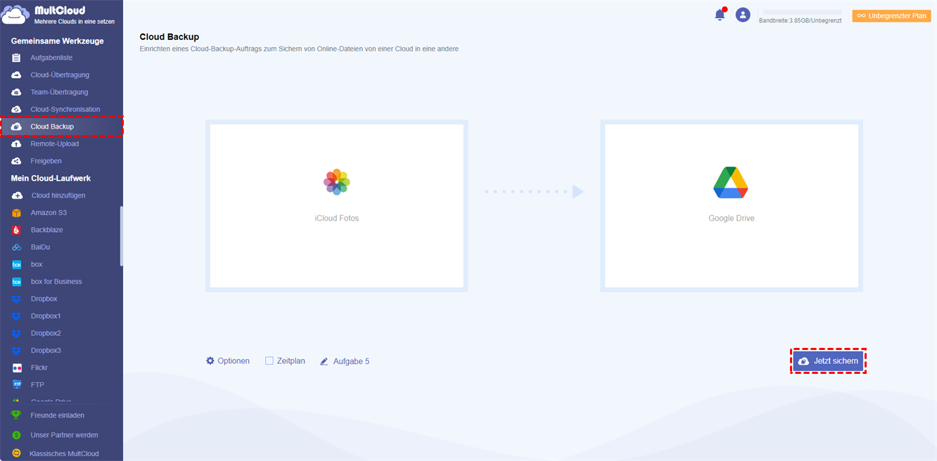 Schritt 3. Klicken Sie auf „Cloud Backup“, wählen Sie iCloud Fotos oder einen Ordner darin als Quelle, und wählen Sie dann Google Drive oder einen Ordner darin als Ziel. Klicken Sie schließlich auf „Jetzt sichern“.