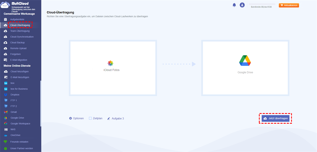 Schritt 2: Klicken Sie in der linken Seitenleiste auf „Cloud-Übertragung“ und wählen Sie in den Feldern „VON“/„AN“ „iCloud-Fotos“ und „Google Drive“ aus. Tippen Sie abschließend auf die Schaltfläche „Jetzt übertragen“, um den Vorgang zu starten.